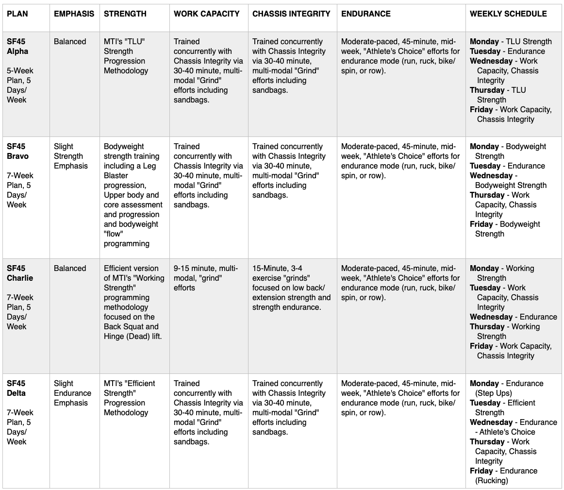 “SF45” is an acronym for “Strength and Fitness 45” and this programming is designed for older tactical and other high impact athletes in the 45-50 age range. SF45 Programming has the following general characteristics: