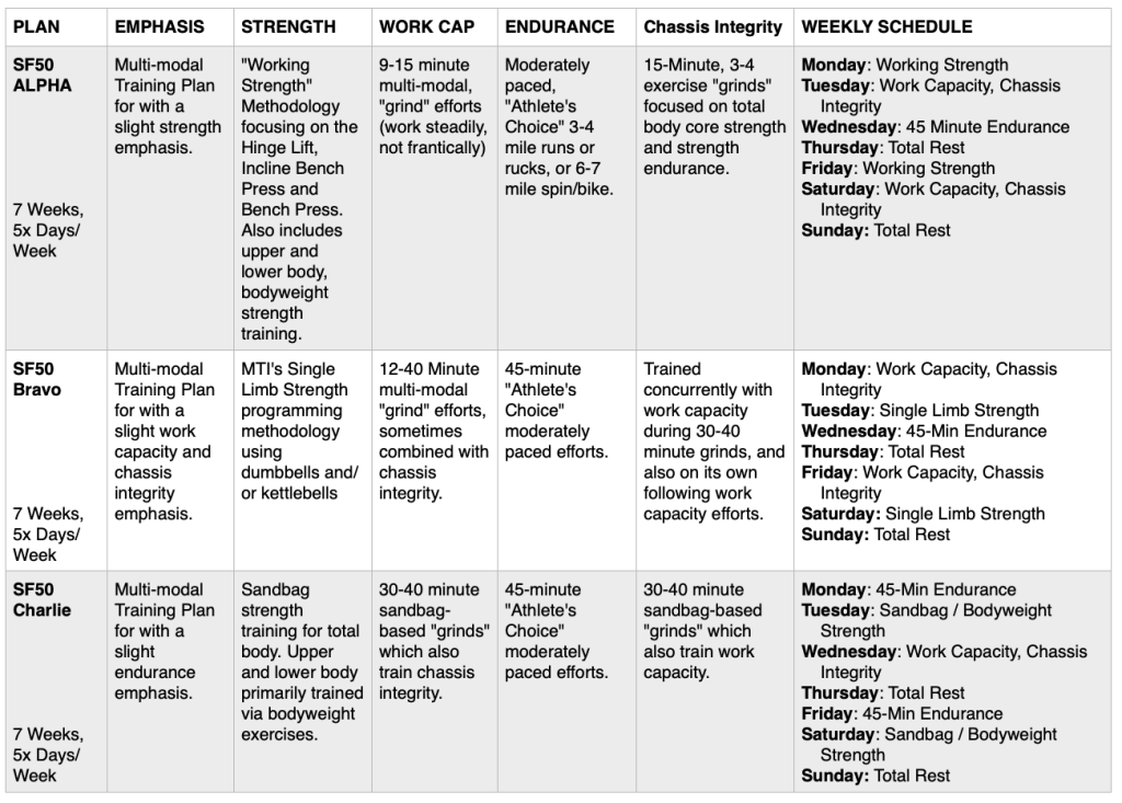 Each SF50 plan is a 6x/week, 7-week training plan. Week 7 of each plan is an unload week, so the plans may be run back-to-back.