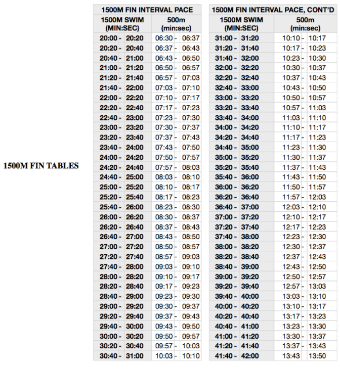 The programming uses the Swimming Interval Chart (see below) to calculate your 500m swim repeat intervals. The interval paces are based on your most recent 1,500m swimming assessment and are completed at a faster pace than your 1,500 assessment pace.